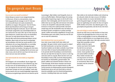 Bram, een man van 68, woont met zijn vrouw Lineke in Hilversum in een eengezinswoning. Hij heeft ernstig nierfalen en moest door zijn ziekte noodgedwongen eerder stoppen met werken. De vermoeidheid als gevolg van de nierziekte vindt Bram het lastigst. Het beperkt hem erg in zijn doen en laten en maakt hem afhankelijk van zijn naasten. Ook voor zijn vrouw heeft zijn ziekte veel gevolgen. Hij vindt het belangrijk dat hulpverleners daarom ook omzien naar haar. Hoe ziet Bram’s leven er nu uit, zijn sociale netwerk, hoe ziet hij zijn toekomst?