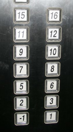 Een liftpaneel in China. De getallen 4 en 14 ontbreken (evenals het algemene ongeluksgetal 13).