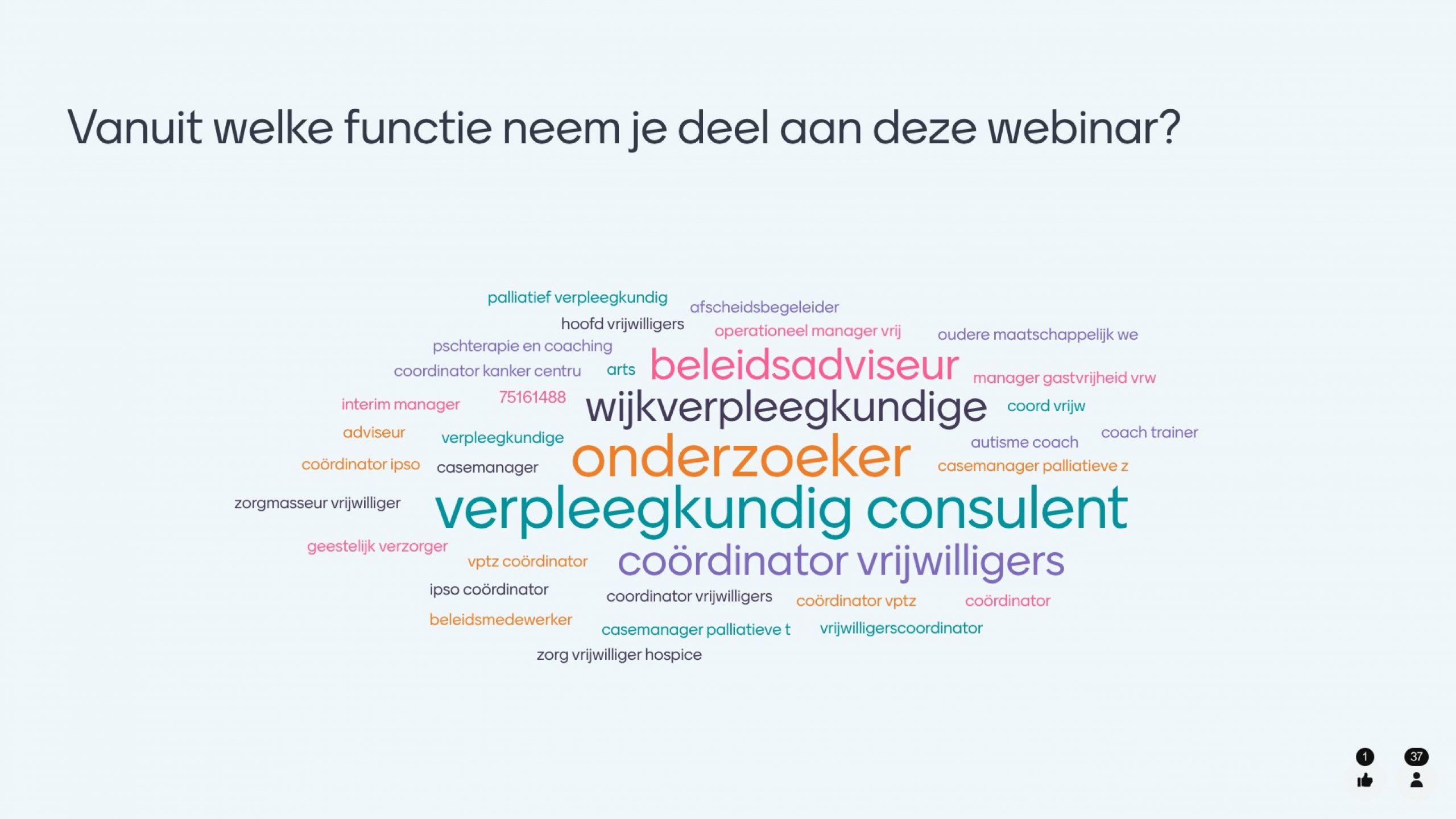 Deelnemers van het webinar hadden diverse achtergronden – van verpleegkundige tot vrijwilligerscoördinator en beleidsadviseur. De meeste deelnemers gaven via Mentimeter aan vooral deel te nemen omdat het onderwerp relevant is voor hun eigen organisatie of afdeling.