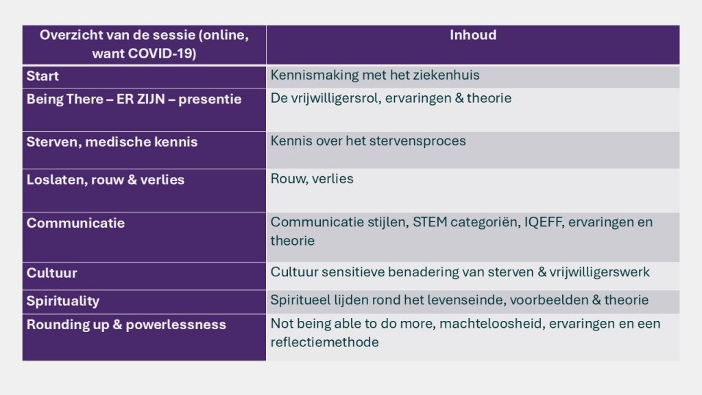 De training voor vrijwilligers in het Maasstad ziekenhuis werd samengesteld met elementen van het internationale onderzoek, de presentietheorie en verschillende VPTZ boekjes met verdiepende onderwerpen over wat zich relationeel voordoet rondom het levenseinde vanuit de rol als vrijwilliger. In acht bijeenkomsten kwamen aan de orde: