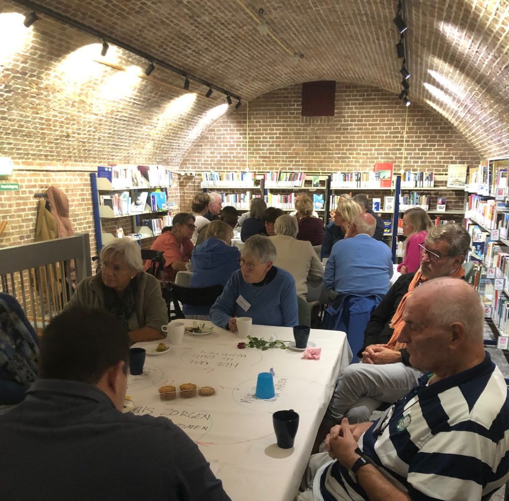 Ik nodigde professionals uit, zoals een huisarts, een hospice, de gemeente en bestaande burgerinitiatieven, en vroeg hen om mee te praten over hoe we meer kunnen doen voor mensen in de laatste 1000 dagen. Er kwam een tweede bijeenkomst, georganiseerd samen met het Netwerk Palliatieve Zorg Gooi en Vechtstreek en met medewerking van Agora. Dit vond plaats in de bibliotheek van Bussum, een andere kern van de gemeente Gooise Meren. Ook daar bleek het besef te worden gedeeld dat we samen verantwoordelijk zijn voor het levenseinde van mensen. Uiteindelijk is er met ongeveer veertig mensen een beweging van onderop ontstaan.’