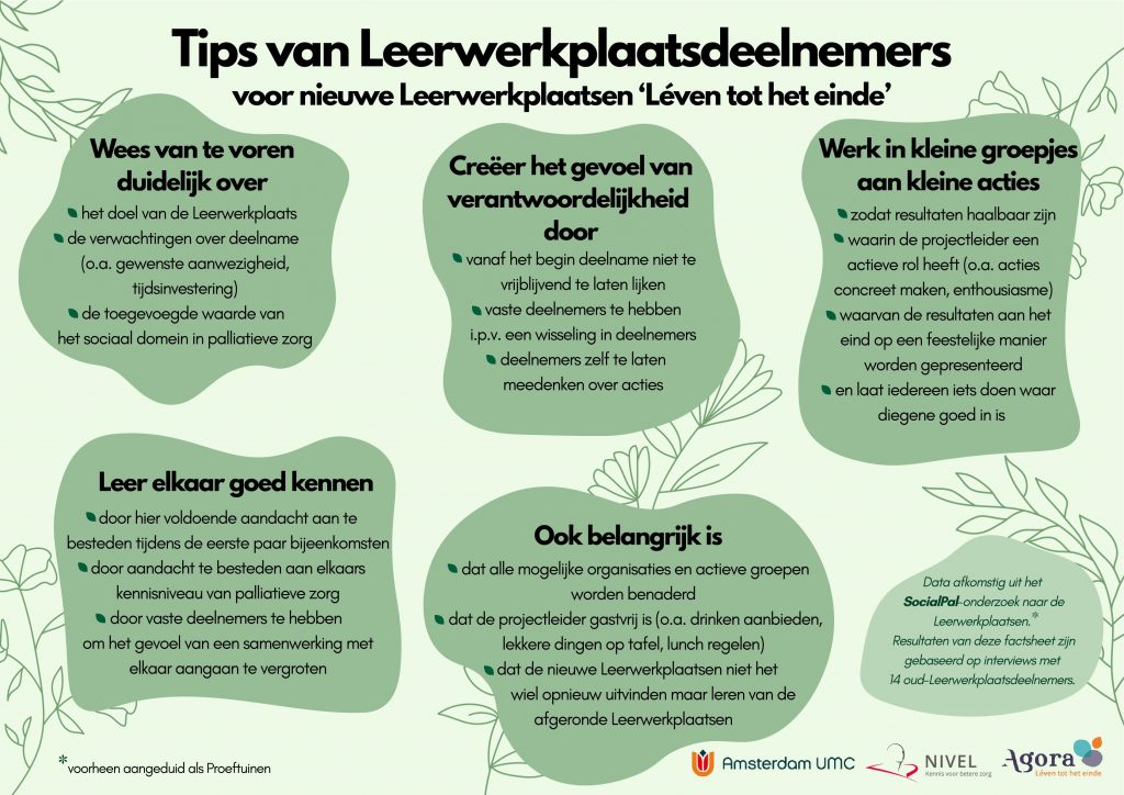 Veertien oud-deelnemers aan de al afgeronde Leerwerkplaatsen Léven tot het Einde (toen aangeduid als Proeftuinen) hebben hun ervaringen en tips gedeeld, zodat nieuwe Leerwerkplaatsen er hun voordeel mee kunnen doen. De tips zijn verzameld in een overzichtelijke factsheet.
