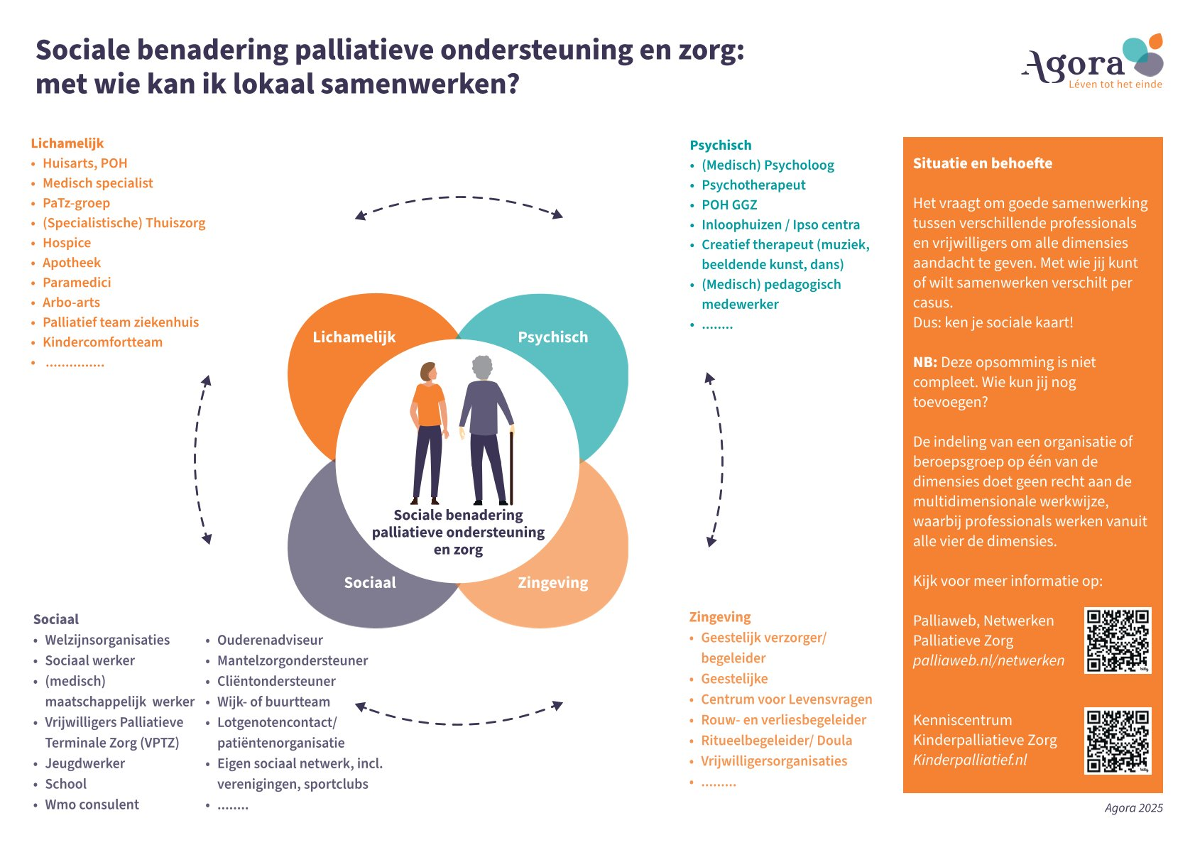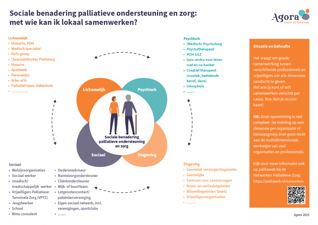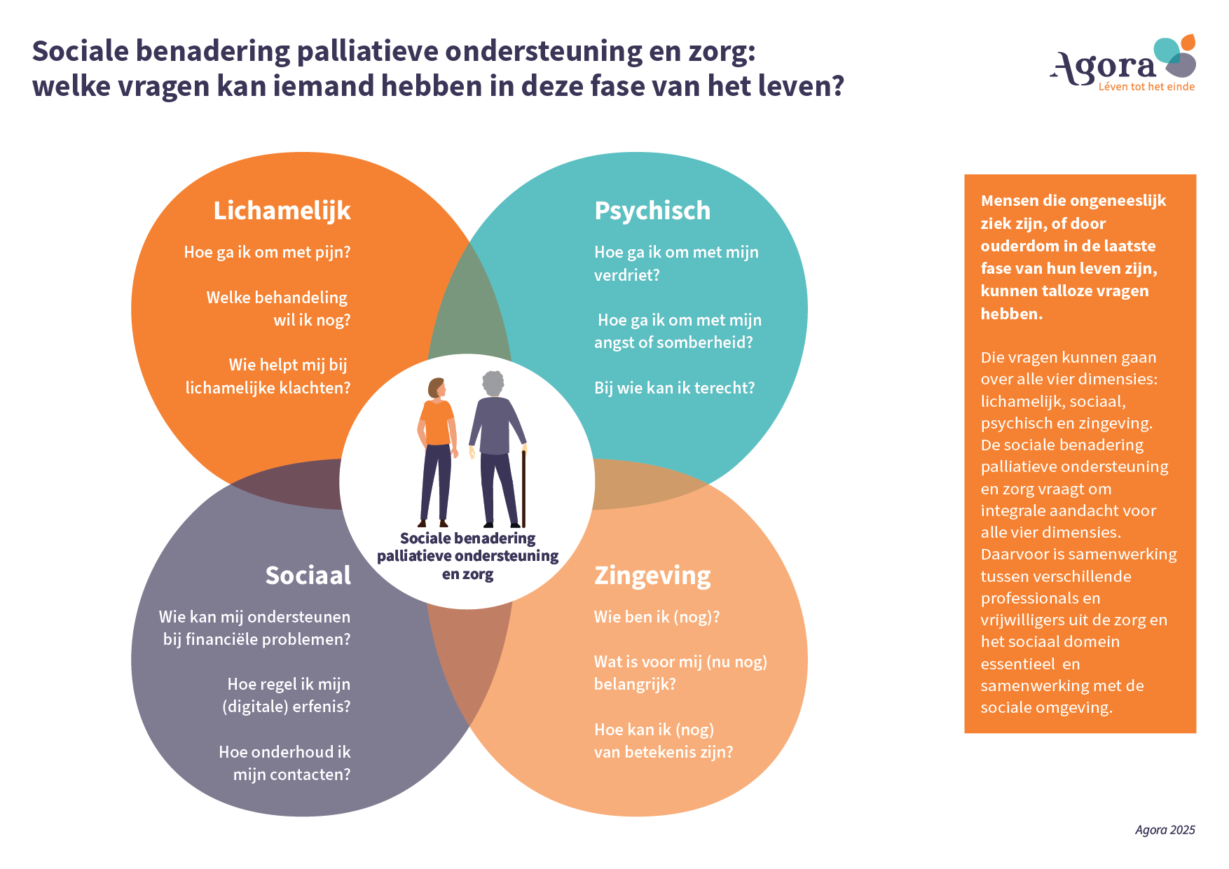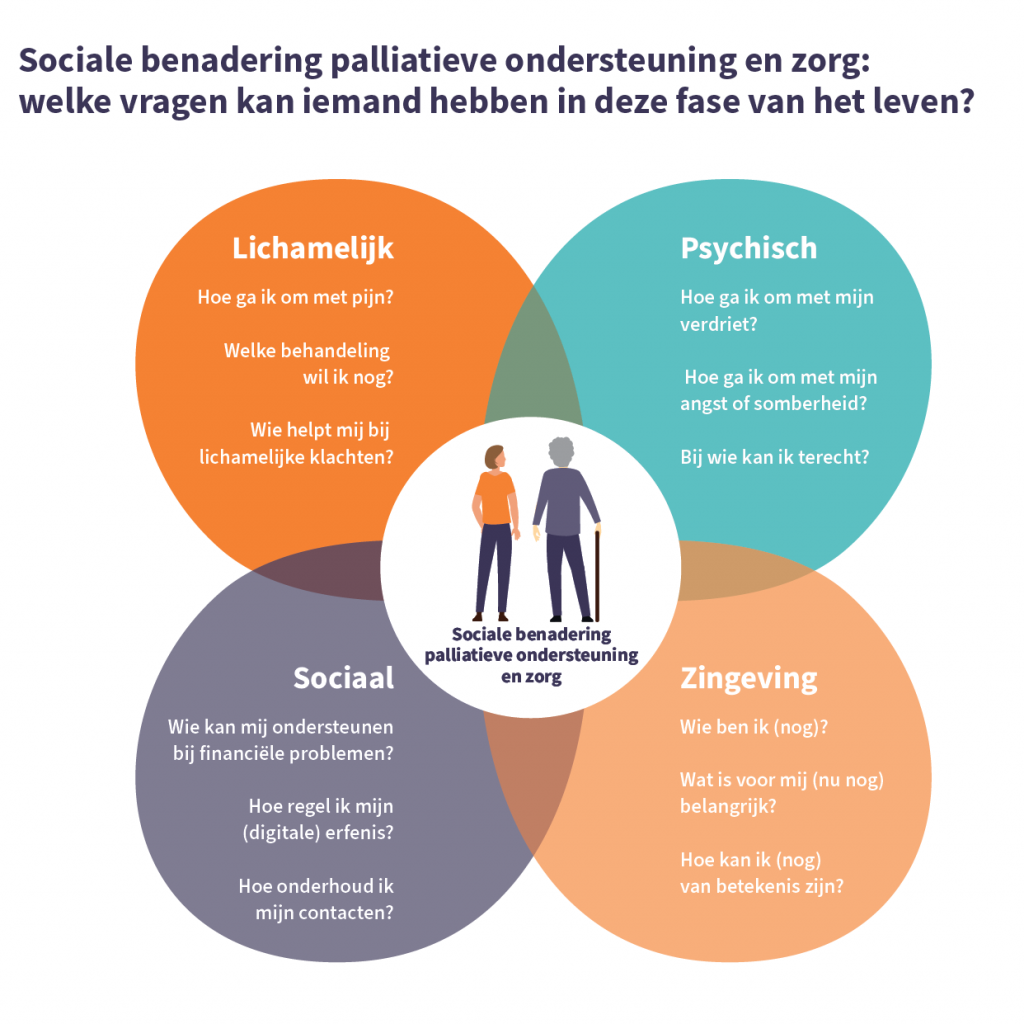 De sociale benadering palliatieve zorg en ondersteuning zet de mens centraal, niet de ziekte. Waar hebben mensen behoefte aan in deze fase van het leven, zowel praktisch als emotioneel? Hoe organiseer je dat zo goed mogelijk? En met wie?